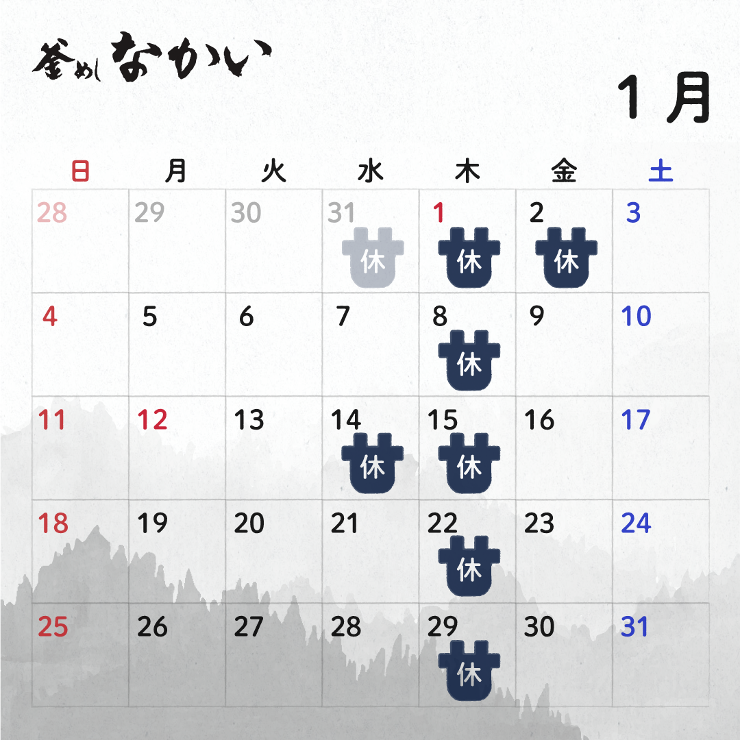 お知らせ 2025.12.05 営業時間のお知らせ いつも釜めしなかいをご利用いただきまして誠にありがとうございます。 下記の通り営業を行います。何卒よろしくお願いいたします。 営業時間 全日 11:00〜16:00 (L.O 15:00) 定休日 木曜日・第2水曜日 ※土日祝日など混雑時には一品料理や定食類などなくなる事が多いです。その場合には釜めしセット、麺類、ドリンク、デザートのみでの営業となりますので、よろしくお願い致します🙇 ※テイクアウトの店内受付はラストオーダーまでに受付表にご記入をお願い致します。 営業カレンダー 定休日 木曜日・第2水曜日 お知らせ